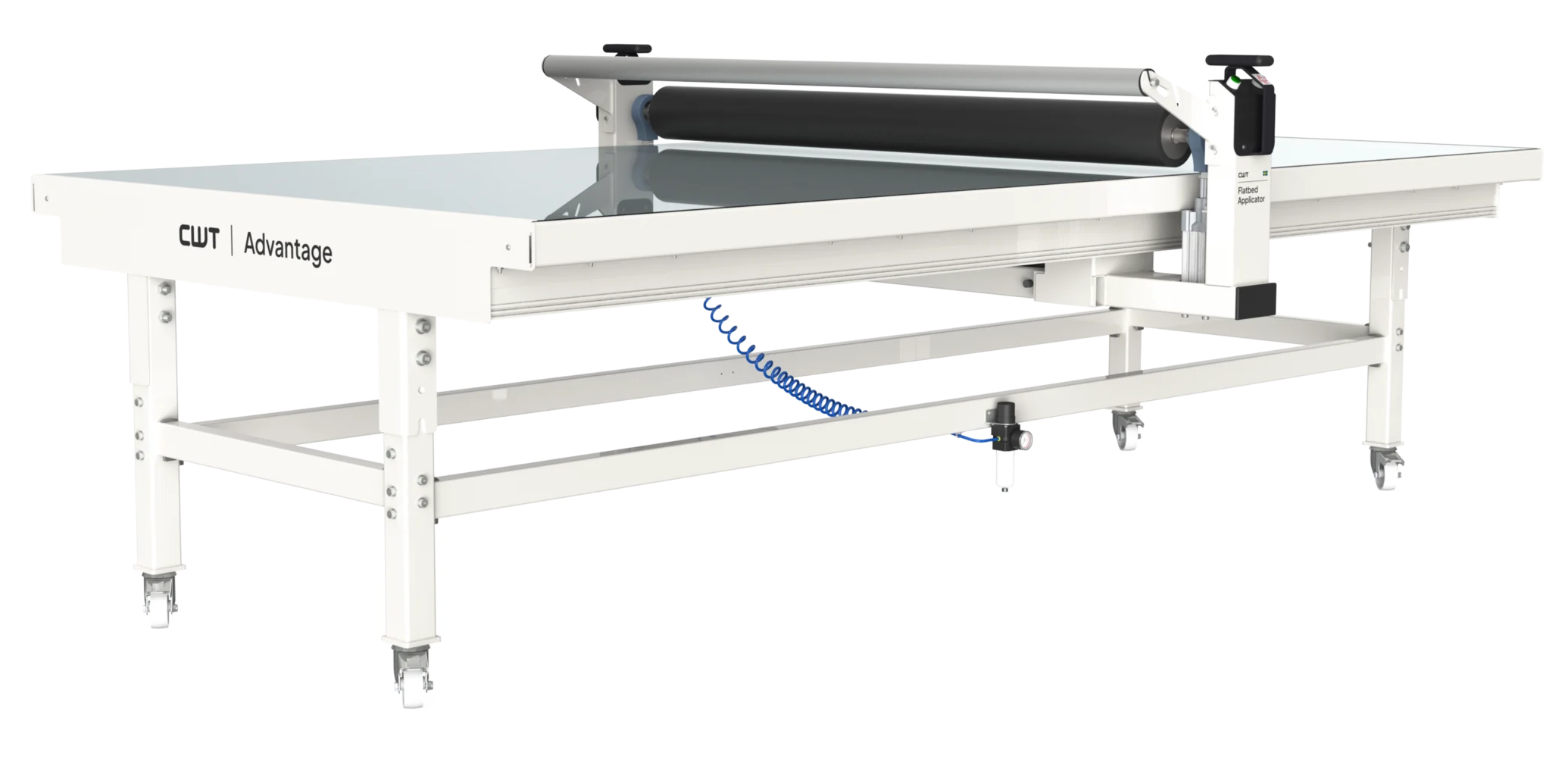 CWT's most refined flatbed applicator, ideal for high-volume production. The CWT Premium Series is equipped with advanced features such as electronic height adjustment, an illuminated worktable, and roll holders, making it perfect for extended, uninterrupted shifts. Included in the ELO series is Electronic Lift Operation.